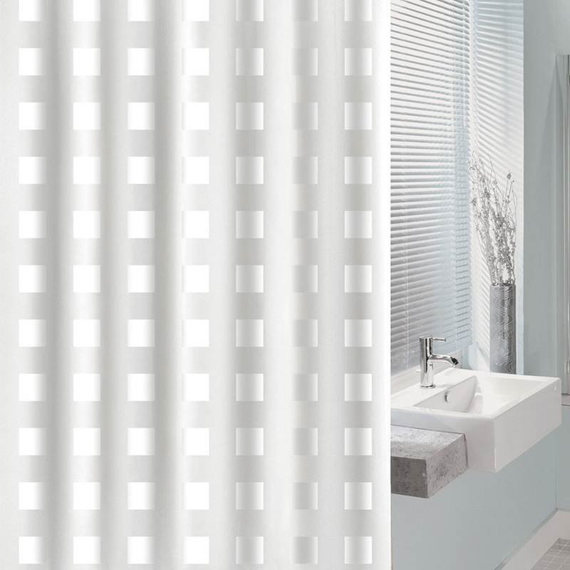 Cortina clásica con estampado de cuadrados en color blanco para bañera o ducha.
