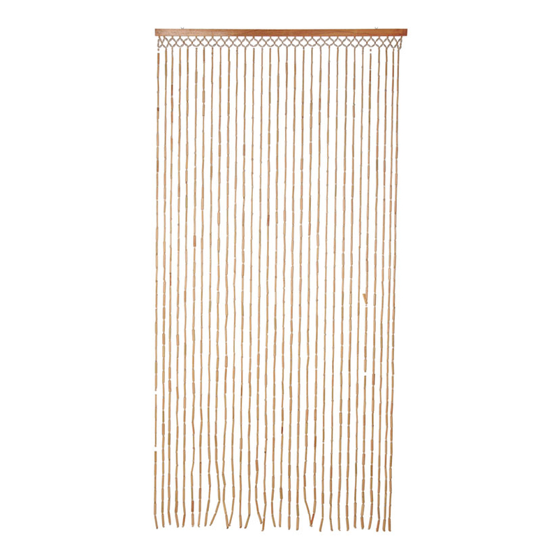 Cortina para puerta fabricada en bambú de alta calidad. Dispone de un palo de madera con dos ganchos para que la puedas colgar fácilmente en la puerta y tenerla abierta, de esta manera evitarás la entrada de insectos al interior. Está disponible en diferentes diseños surtidos.