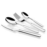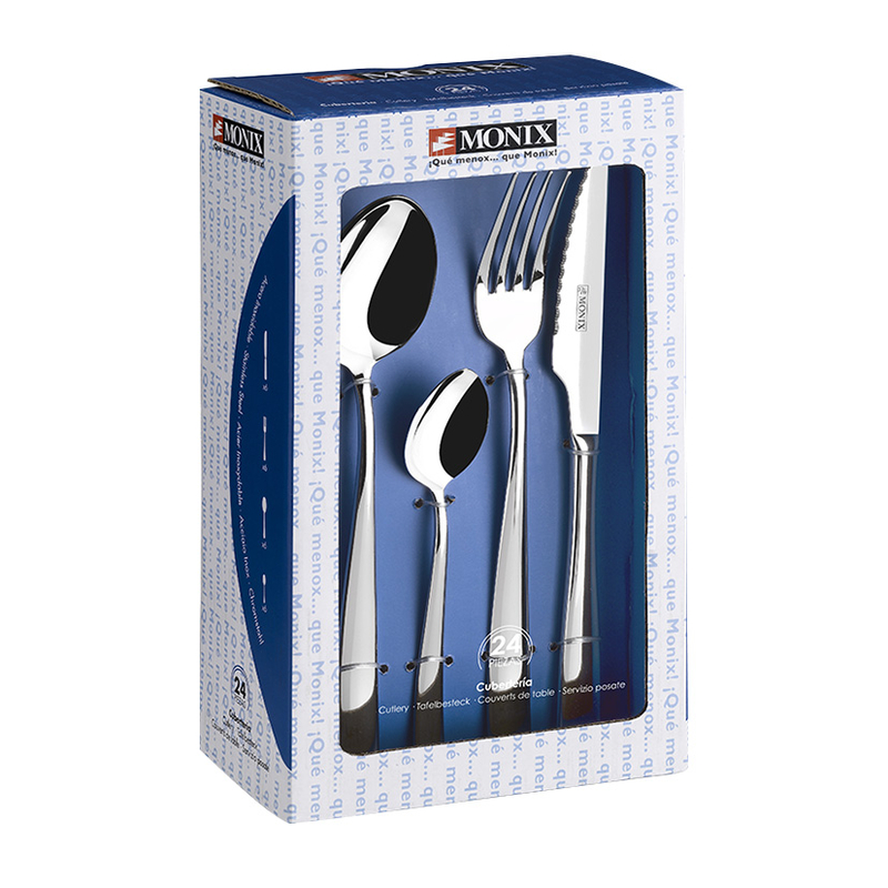 Este estuche está compuesto por 6 cucharas, 6 tenedores, 6 cuchillos de mesa y 6 cucharas de postre fabricados en acero inoxidable 18/10. Esta cubertería es apta para el lavavajillas. Viene presentado en caja.