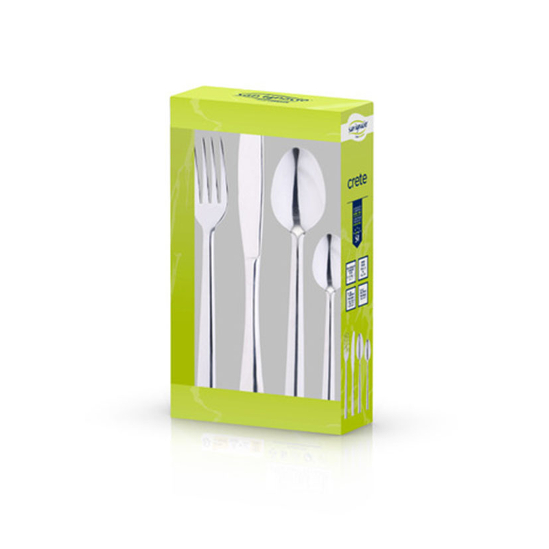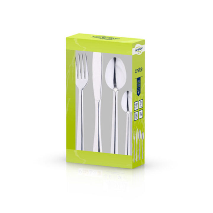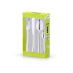 Este estuche está compuesto por 6 cucharas, 6 tenedores, 6 cuchillos de mesa y 6 cucharas de postre fabricados en acero inoxidable. Esta cubertería es apta para el lavavajillas. Viene presentado en caja.