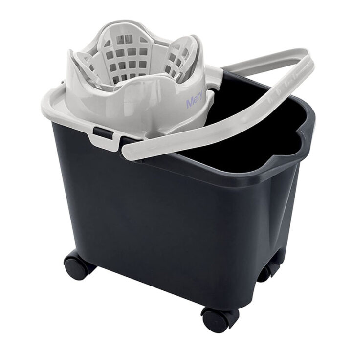 Amplio escurridor para todo tipo de fregonas. Dispone de sujeción para el palo ruedas giratorias para facilitar el transporte.Color gris. 14 litros.