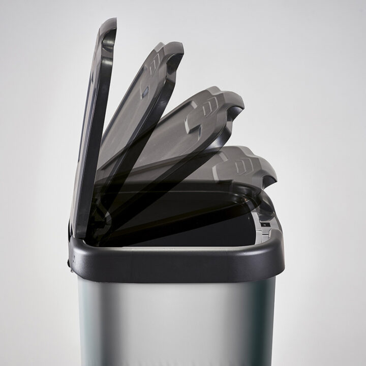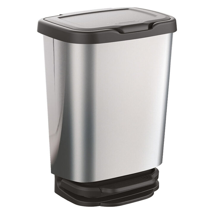 Este cubo está fabricado en plástico con acabado exterior cromado que incorpora un pedal en la base para abrir la tapa de una forma automática sin utilizar las manos. Tiene una capacidad de 20 litros.