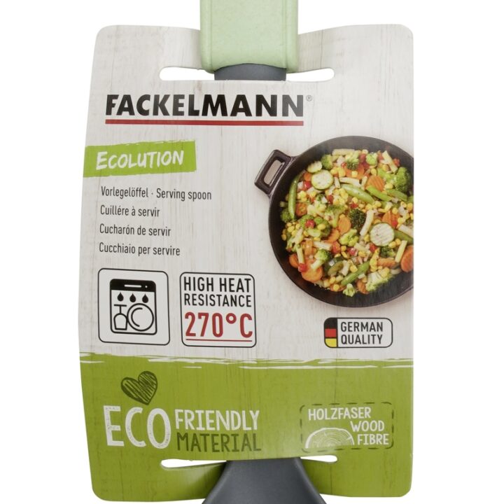 La cuchara para servir FACKELMAN de la serie Ecolution está fabricada con materiales renovables fibras de madera y bioplástico en colores discretos en tonos naturales; gris piedra y verde menta. Su mango es ergonómico para un fácil manejo y en el extremo de éste tiene un agujero para que lo puedas colgar en la cocina. La serie Ecolution es apto para el lavavajillas y resistente al calor hasta +270 ºC. Puedes combinarlo con el resto de accesorios para cocina de esta misma serie.