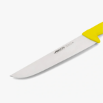 Este cuchillo de carnicero está especialmente diseñado para el corte de carne, ofreciendo precisión, seguridad y comodidad en cada uso. Cuenta con un mango de color amarillo, ergonómico y antideslizante, que se adapta perfectamente a la mano del usuario y evita deslizamientos durante el corte. Su hoja está fabricada en acero inoxidable Nitrum®, un material patentado por Arcos que incrementa la potencia de corte y mejora significativamente la durabilidad del cuchillo. Es resistente a altas temperaturas de entre 120 y 130 ºC, a pequeños golpes y al uso de productos químicos, lo que lo hace ideal tanto para entornos profesionales como domésticos. Además, está certificado por NSF y puede introducirse en el lavavajillas, aunque se recomienda la limpieza a mano para prolongar su vida útil.