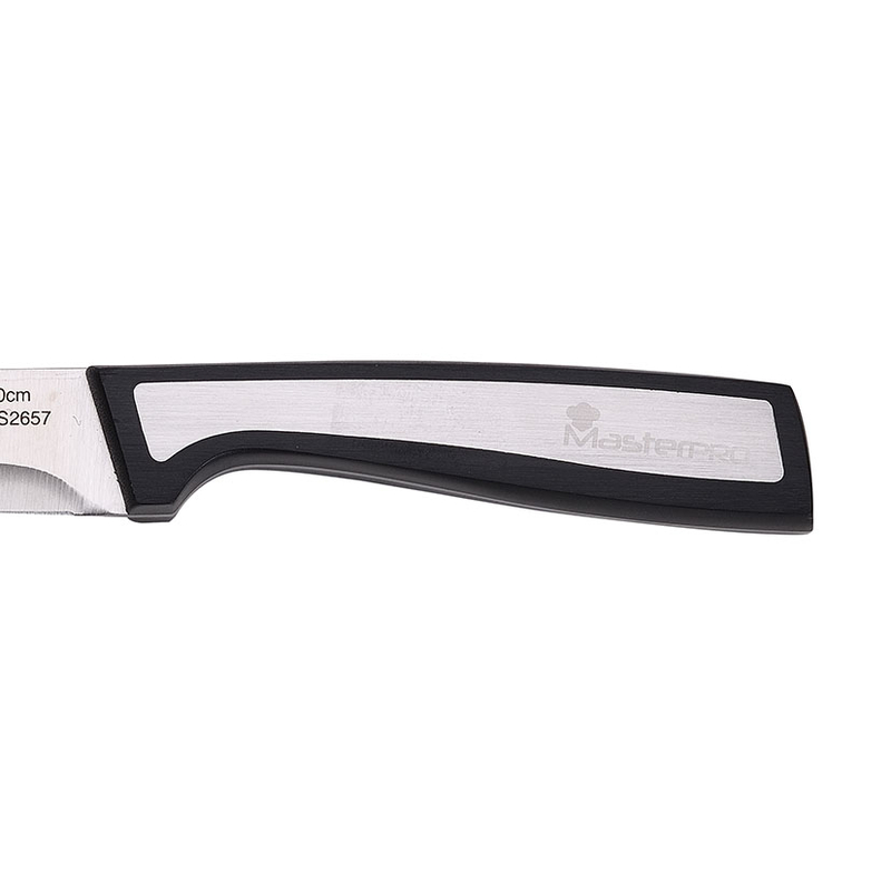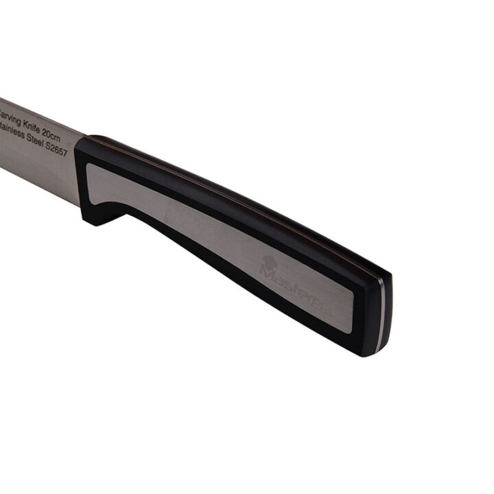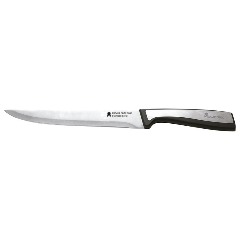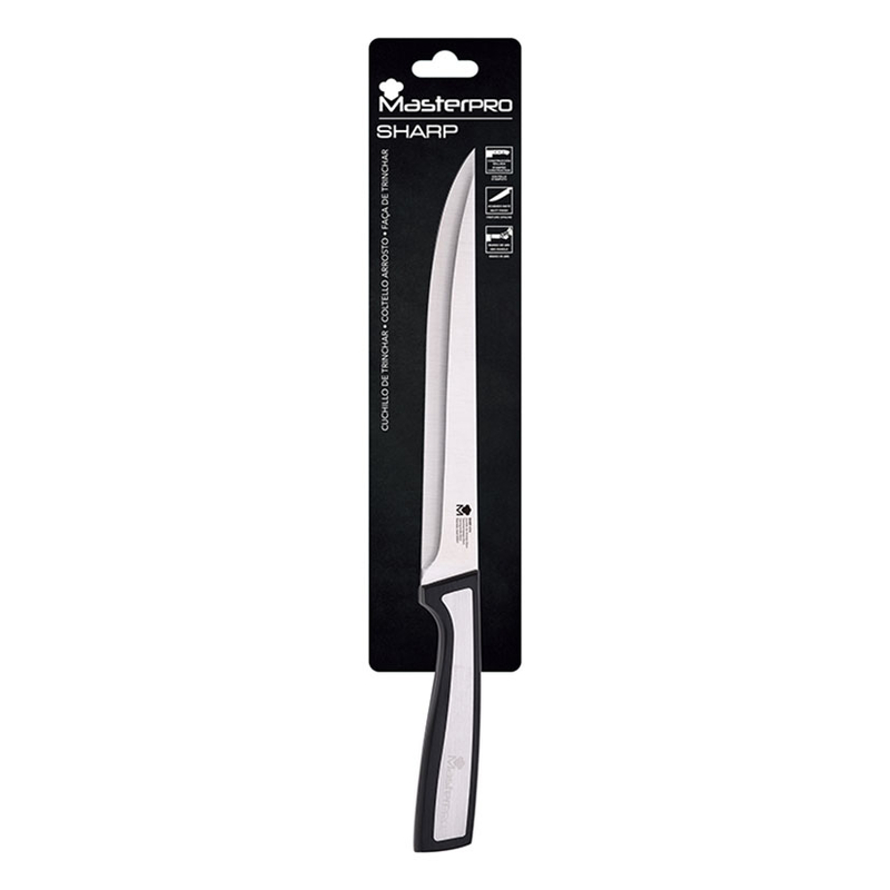La gama de cuchillos de la serie Sharp de la marca MASTERPRO están fabricados en acero inoxidable acabado en mate, con mango estampado y son profesionales. Se caracterizan por su espiga completa que aporta una mayor durabilidad. Las hojas insertas en el mango, tienen el mismo espesor a lo largo de toda la superficie. Los mangos presentan un diseño ergonómico y de tacto suave que se adaptan perfectamente a tu mano. Este cuchillo trinchador destaca por una elevada durabilidad, calidad y resistencia. Además, mantiene su filo incluso despues de múltiples usos. Es de fácil limpieza y su ligereza y su cuidado balance permiten una manipulación segura evitando los accidentes. En nuestra web disponemos de más modelos de cuchillos de esta misma gama.