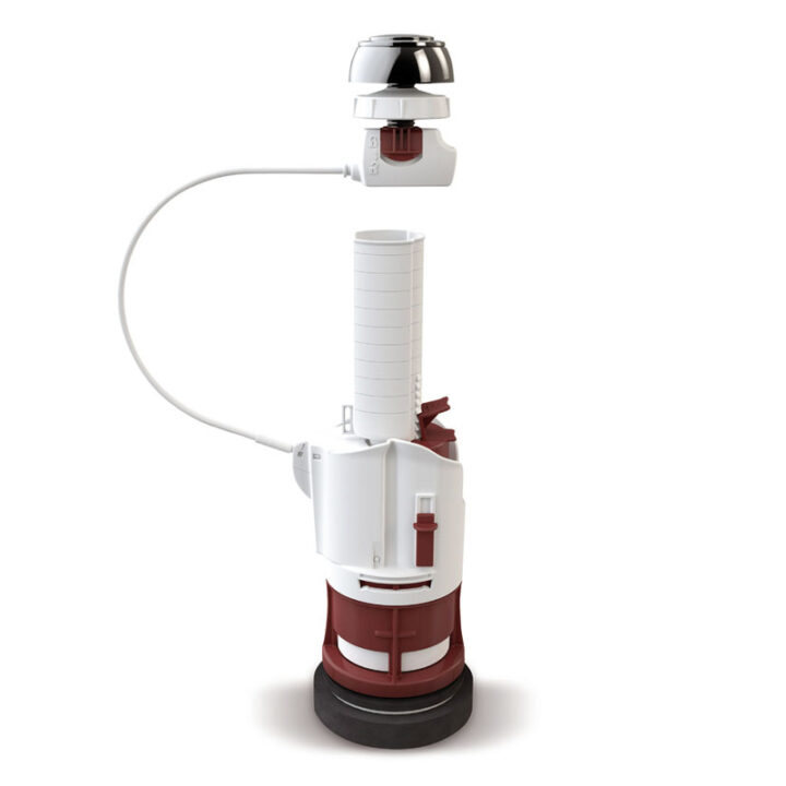 Esta descarga cisterna tiene un mecanismo de doble pulsador con cable transmisor que se adapta a cualquier inodoro de tanque bajo provistos con una base roscada o con enchufe rápido. Se presenta en una caja.