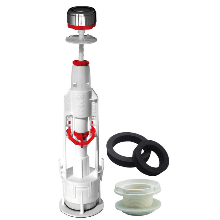 La descarga con transmisión directa tiene un mecanismo universal de pulsador interrumpible y descarga interrumpible de agua que permite ahorrar litros de agua al año. Se adapta a todo tipo de cisternas. Además es adaptable a base ROCA. Se presenta en una bolsa.