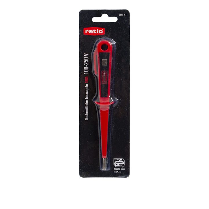 Este destornillador buscapolos permite un preciso contacto con el polo vivo y neutro y es una herramienta muy útil para labores de bricolaje y de electricidad profesional. Está diseñado con un sistema de circuito abierto de alta funcionalidad, es muy seguro y práctico de utilizar. Detección de tensión 100-250V. Está fabricado en un material aislante y clip de bolsillo. Tiene el certificado TÜV-GS. DIN/VDE 0680 (6/04.77). Se presenta en un blíster.