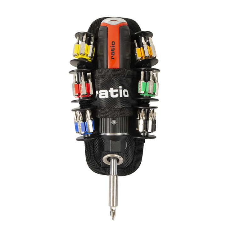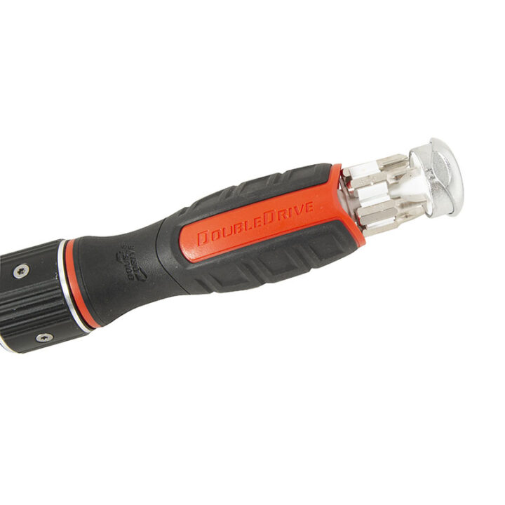 Esta herramienta múltiple dispone de un sistema de carraca reversible Double Drive; con un revolucionario diseño de engranajes que duplica por 2 la velocidad de atornillado para realizar trabajos en todas direcciones y de una manera mucho más cómoda. Dispone de mango antideslizante bimaterial con depósito para puntas puntas dentro del mismo y está diseñado para trabajar como un destornillador estándar o como uno de tipo carrocero con sistema de carraca. Las puntas son de acero cromo-vanadio S2. Además incluye un adaptador magnético 60 mm y soporte para cinturón con sistema de fácil acceso a cartuchos de puntas.