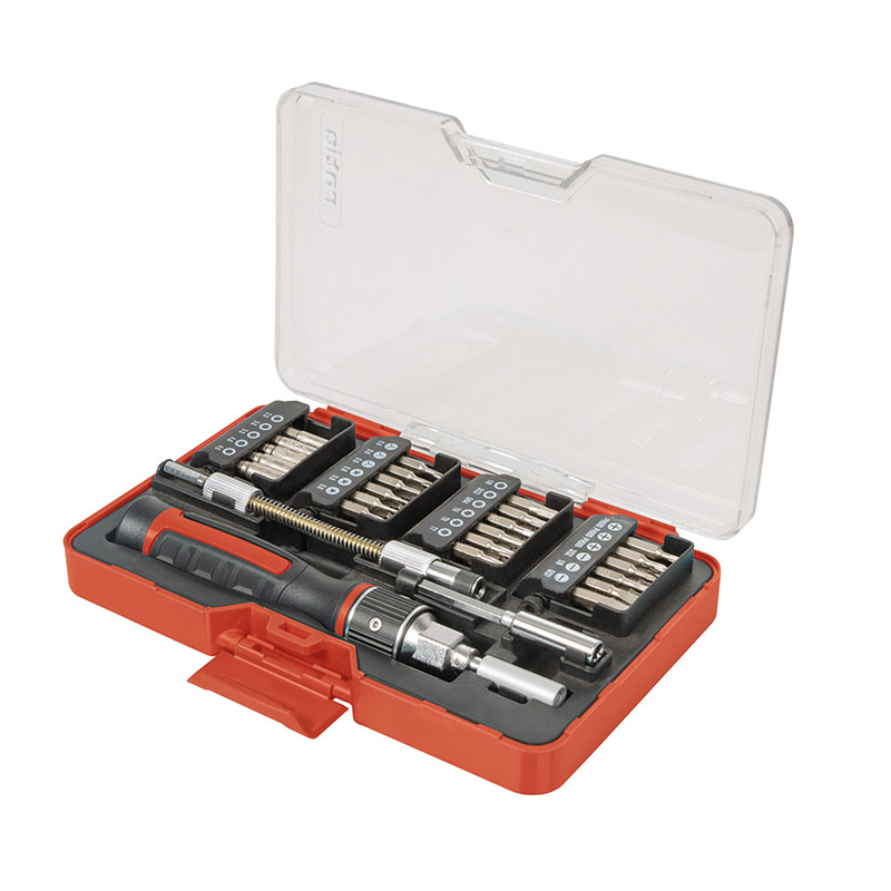 Esta herramienta múltiple dispone de un sistema de carraca reversible Double Drive; con un revolucionario diseño de engranajes que duplica por 2 la velocidad de atornillado para realizar trabajos en todas direcciones y de una manera mucho más cómoda. Dispone de mango antideslizante bimaterial con depósito para puntas dentro del mismo. Está diseñado para trabajar como un destornillador estándar o de tipo carrocero con sistema de carraca. Las puntas son de acero cromo-vanadio S2. Además, incluye un adaptador magnético 60 mm, prolongador flexible 120 mm y un estuche de plástico.