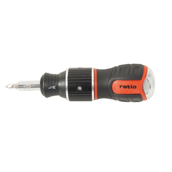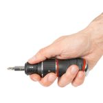 Herramienta múltiple, muy útil, que puede funcionar como un destornillador estándar o como uno de tipo carrocero con sistema de carraca.