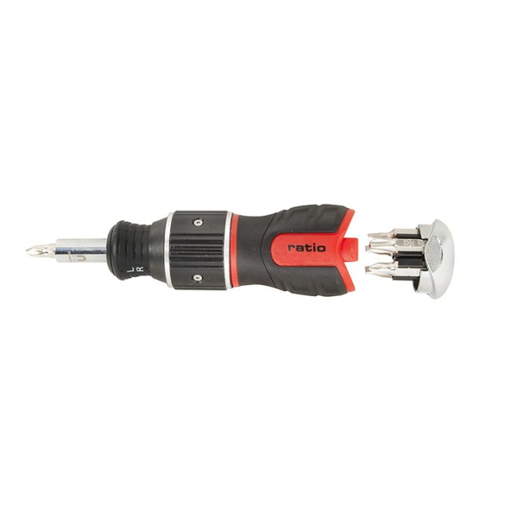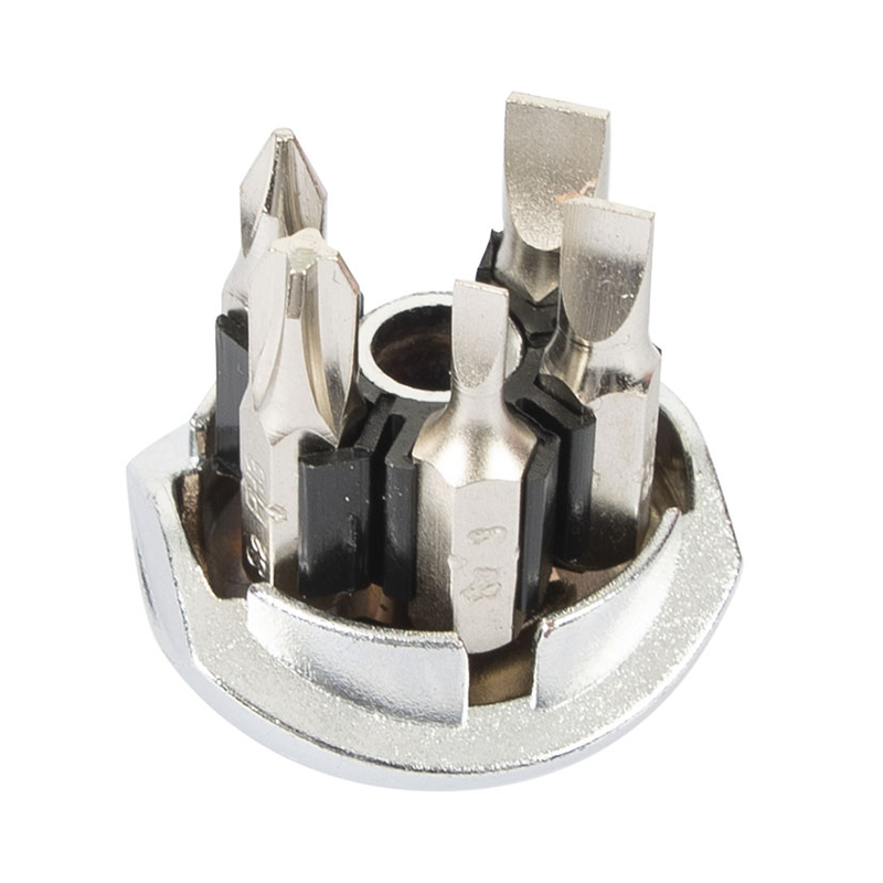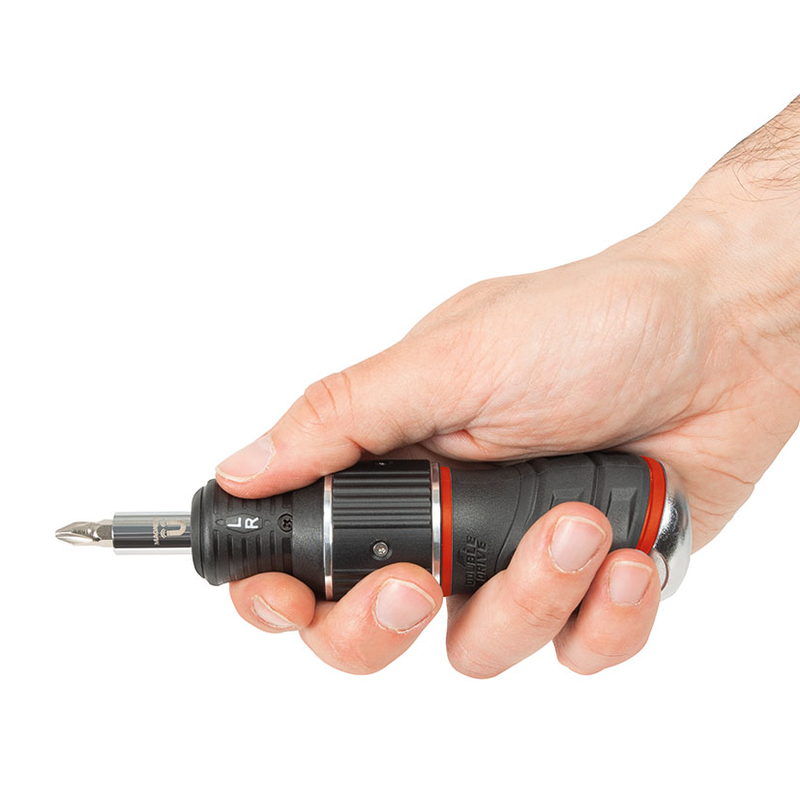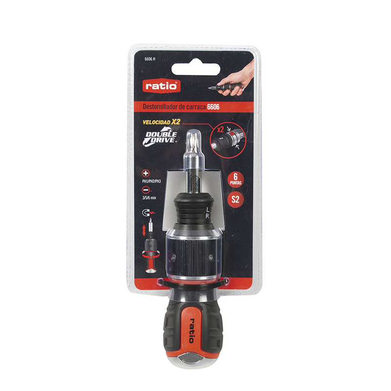 Esta herramienta múltiple dispone de un sistema de carraca reversible Double Drive; con un revolucionario diseño de engranajes que duplica por 2 la velocidad de atornillado para realizar trabajos en todas direcciones y de una manera mucho más cómoda. Dispone de mango antideslizante bimaterial con depósito para puntas dentro del mismo con sistema de carraca. Las puntas son de acero cromo-vanadio S2.