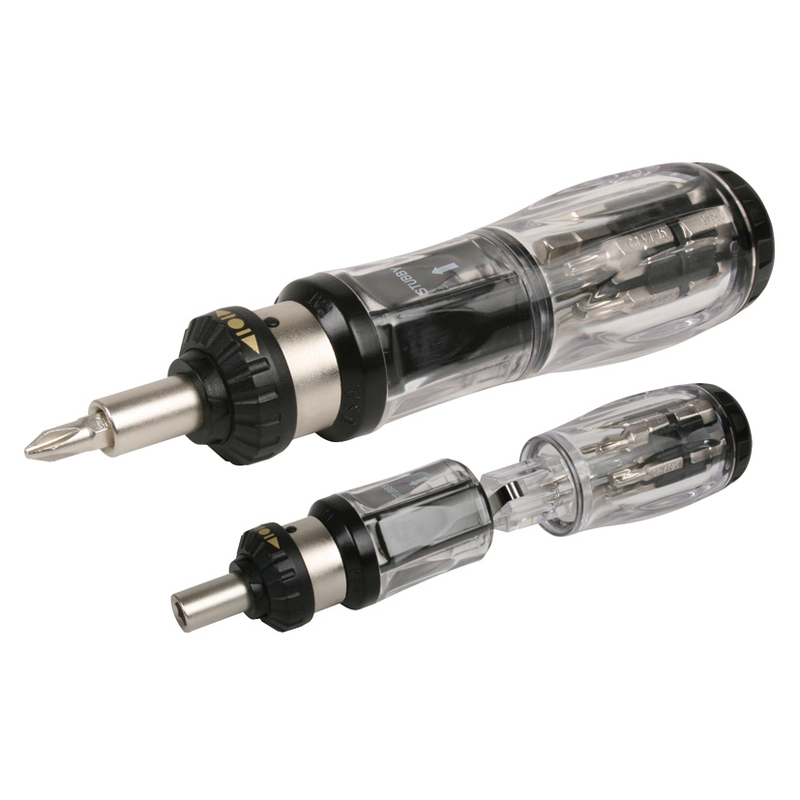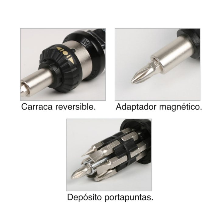 Esta herramienta múltiple dispone de un sistema de carraca reversible para realizar trabajos en todas direcciones y de una manera mucho más cómoda. Dispone de un portapuntas magnético con depósito para puntas dentro del mango y está diseñado para trabajar como un destornillador estándar o como uno de tipo carrocero con sistema de carraca. El mango tiene un depósito para guardar las puntas. Se presenta en una caja display de 6 destornilladores.