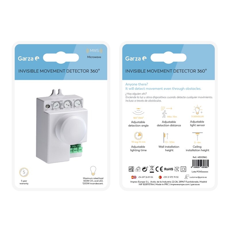 Detector de movimiento microondas invisible para colocar en zonas visibles o invisibles como dentro de un mueble, en un falso techo o tras las cortinas. Con la detección del movimiento podrás activar las luces o un cambio de temperatura gracias a sus sensores.