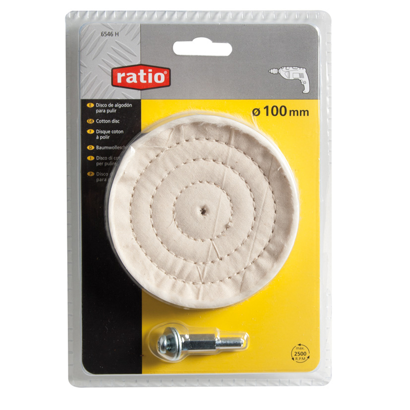 El disco de algodón RATIO te permitirá realizar trabajos con acabados de gran calidad. Cuenta con un diámetro de 100 mm e incluye eje de 6 mm. Se presenta en un doble blíster.