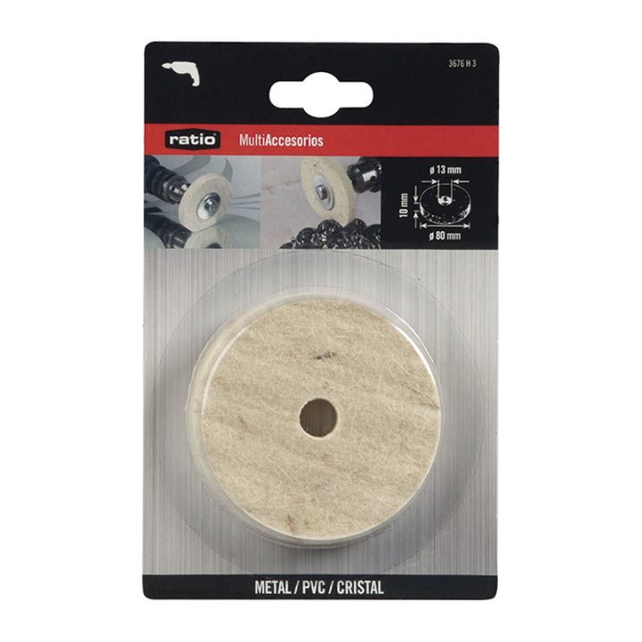 El disco de fieltro RATIO te permitirá realizar trabajos con acabados de gran calidad. Cuenta con unas medidas de ø 80×10 mm y un agujero de ø 13 mm. Se recomienda su uso en taladros de 3000 rpm. Para su uso es necesario obtener el eje adaptador RATIO referencia 3676H2 y la pasta de pulido RATIO ref. 3676H1 que disponemos en nuestra web. Se presenta en un blíster.