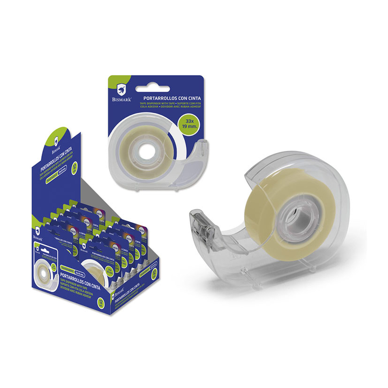 El dispensador de cinta adhesiva BISMARK es un portarrollos con cuerpo de plástico. Incluye una cinta adhesiva transparente de 33 metros de longitud y 19 mm de ancho.