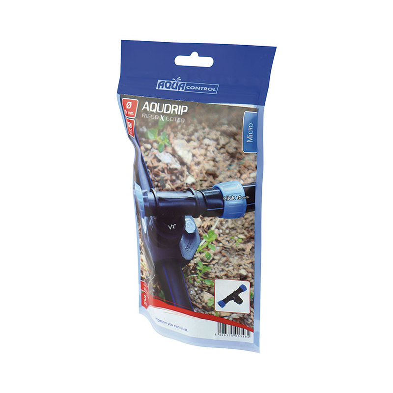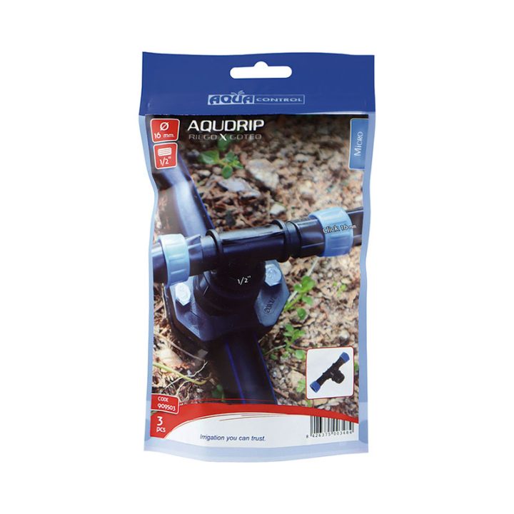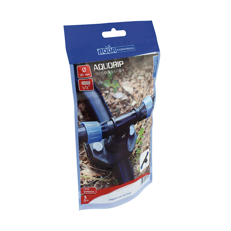Te RM para cinta plana ø 16mm, permite sacar dos tramos de cinta plana con goteros a partir de un accesorio con RH 1/2. Este enlace facilita la distribución de agua de forma uniforme, asegurando un riego óptimo en jardines, huertos o áreas agrícolas. Con una presión máxima de trabajo de 1,2 Bar (recomendable instalar un reductor de presión)