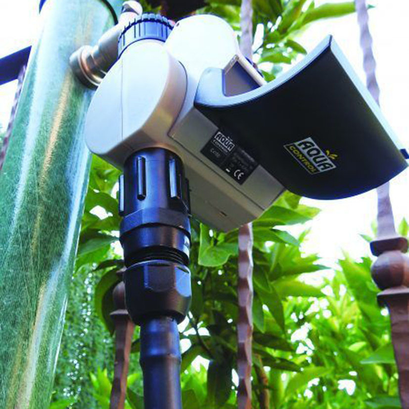 1A. Conecte al grifo los siguientes elementos en este orden: programador, reductor de presión, filtro y adaptador.