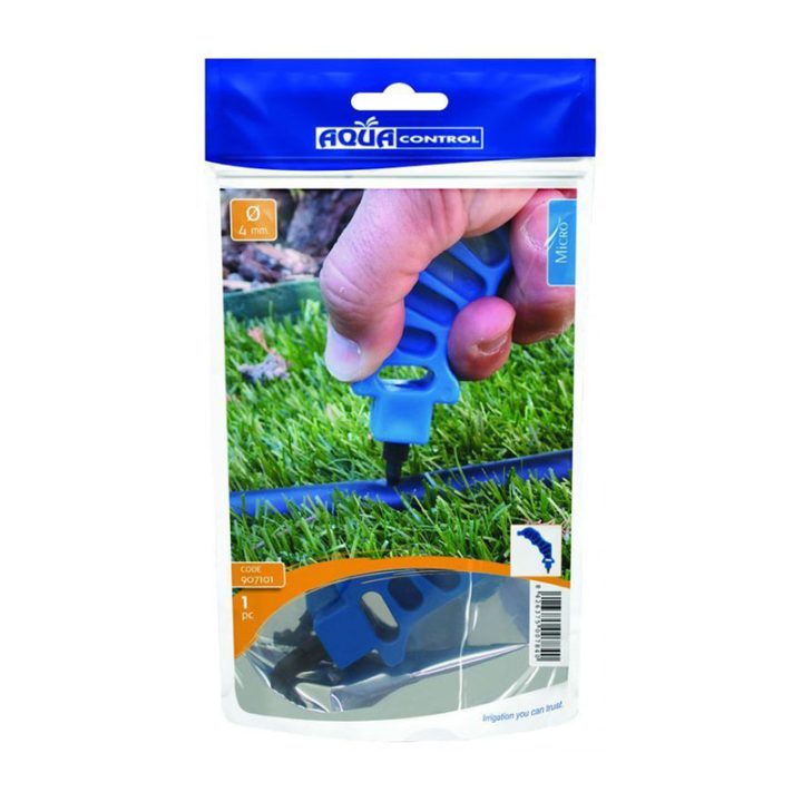 Perforador insertador para sistema de riego por goteo, que se basa en el aporte continuo de agua sobre la superficie del suelo (riego superficial), de manera que solo se moja una parte del suelo, la más próxima a la planta.