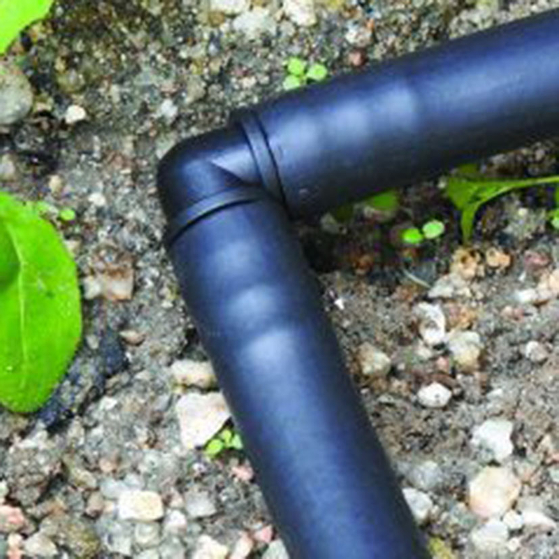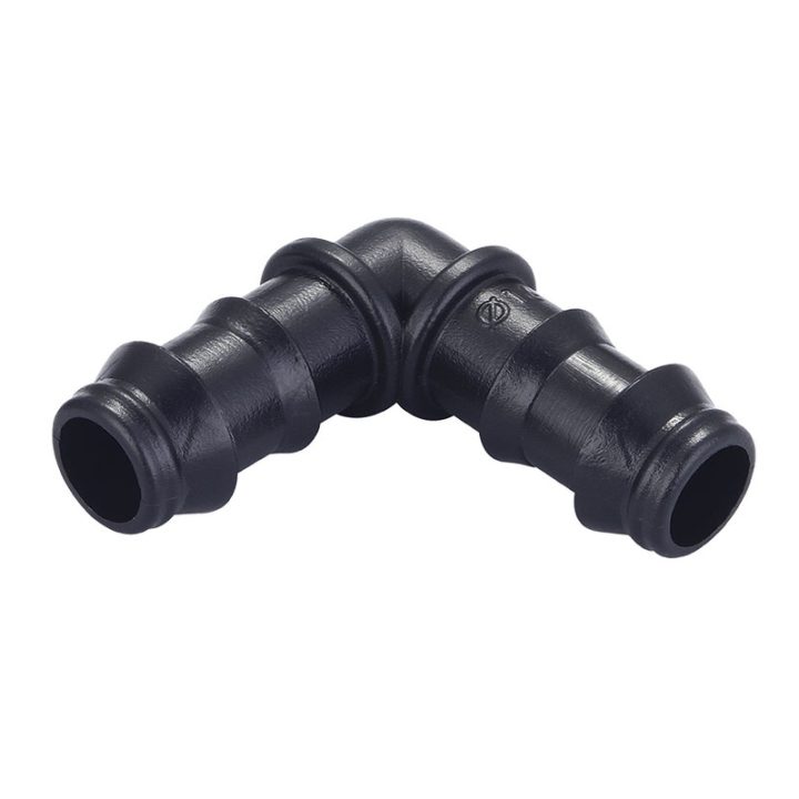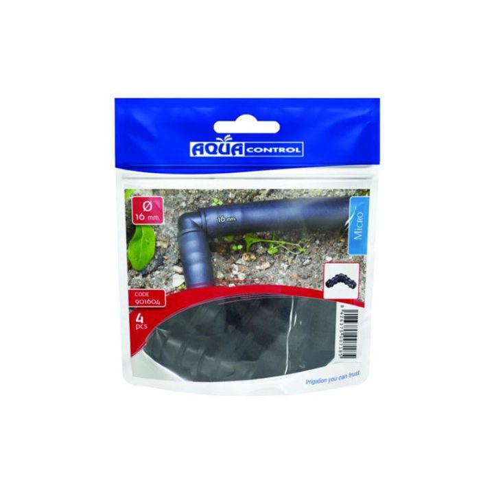 Set de 4 unidades de codos para sistema de riego por goteo, que se basa en el aporte continuo de agua sobre la superficie del suelo (riego superficial), de manera que solo se moja una parte del suelo, la más próxima a la planta.