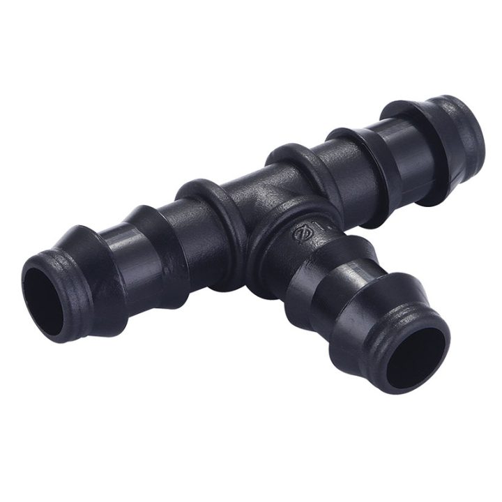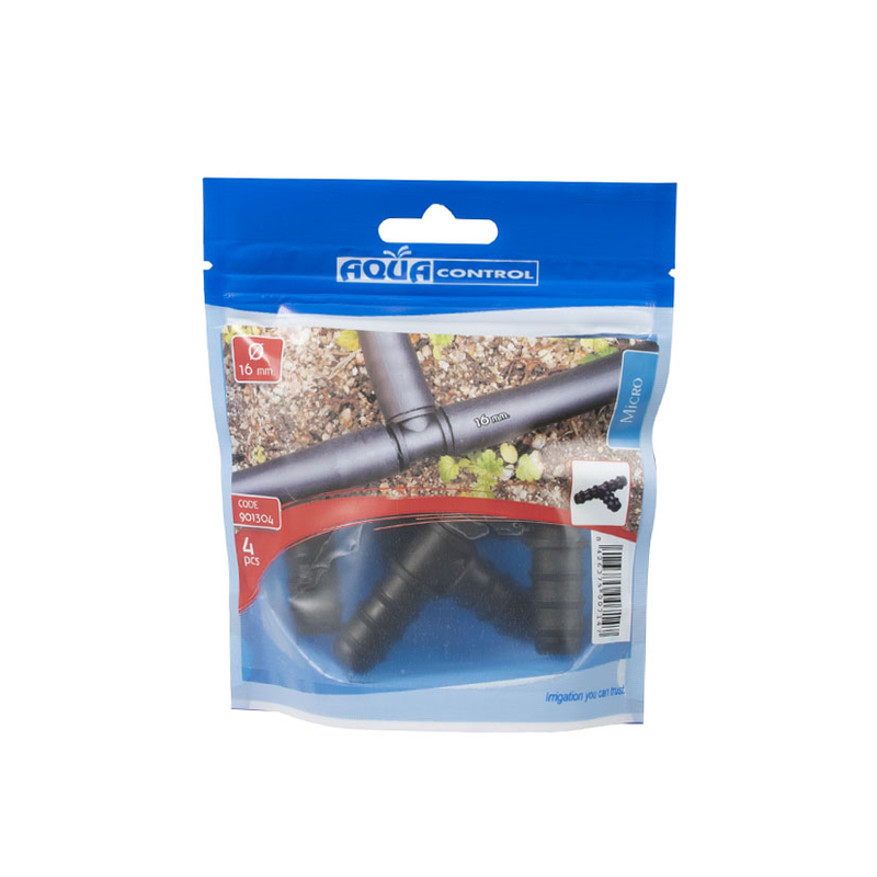 Set de 4 unidades de «T» 16 mm para sistema de riego por goteo, que se basa en el aporte continuo de agua sobre la superficie del suelo (riego superficial), de manera que solo se moja una parte del suelo, la más próxima a la planta.