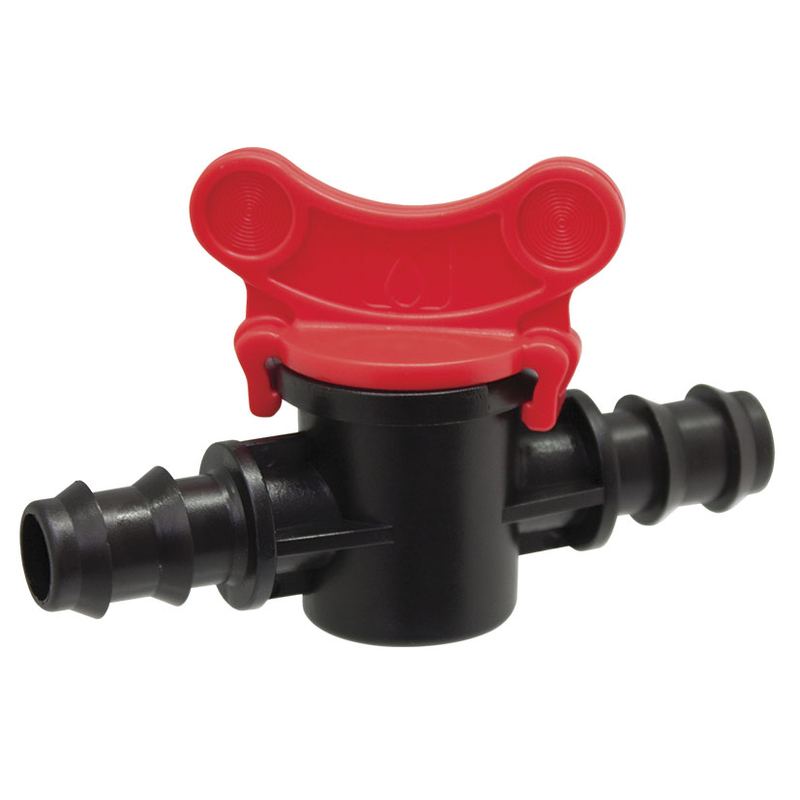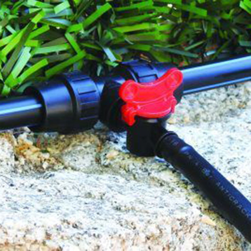 Válvula de cierre de 16 mm para sistema de riego por goteo, que se basa en el aporte continuo de agua sobre la superficie del suelo (riego superficial), de manera que solo se moja una parte del suelo, la más próxima a la planta.