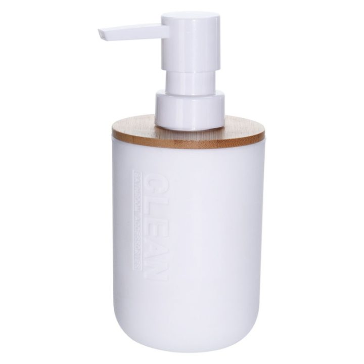 Este dosificador de jabón combina elegancia y funcionalidad, fabricado en una mezcla de bambú y plástico blanco. Su diseño permite un uso fácil y cómodo, convirtiéndolo en un accesorio esencial para tu hogar.