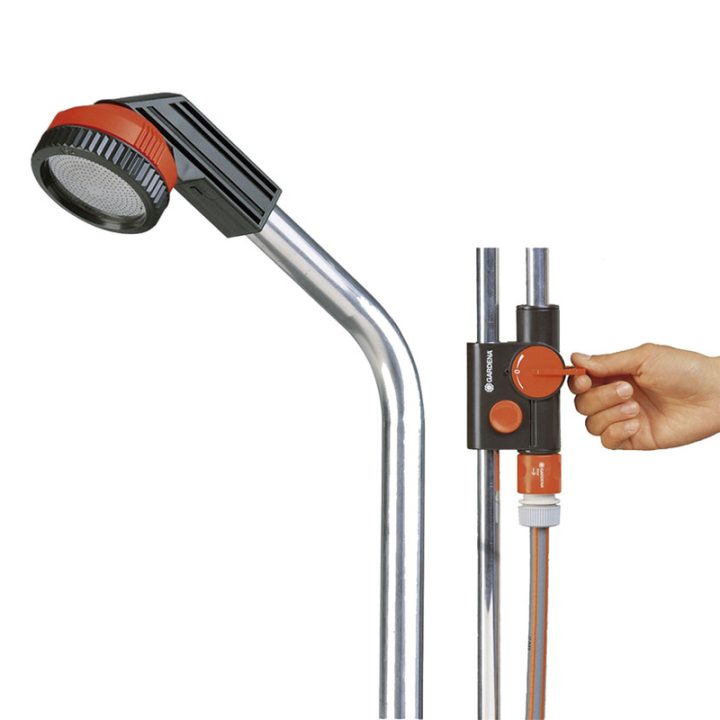 Ducha de tubo en aluminio con válvula que regula el caudal del agua.