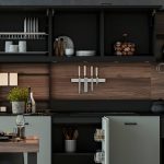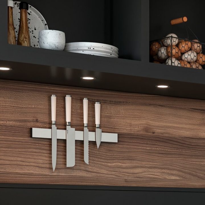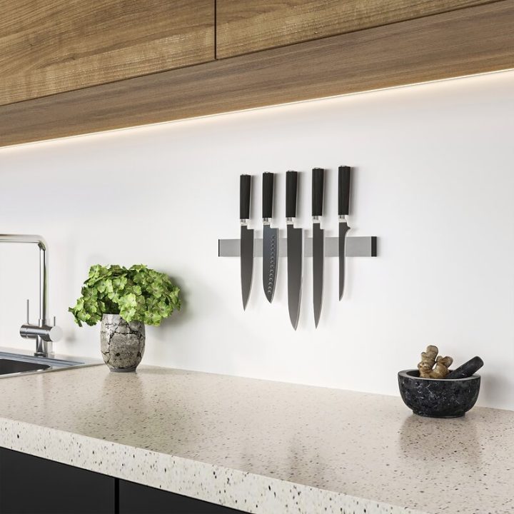 Barra magnética de pared para el menaje metálico de la cocina.