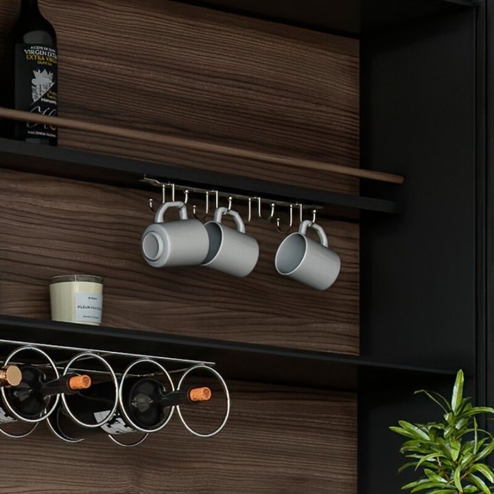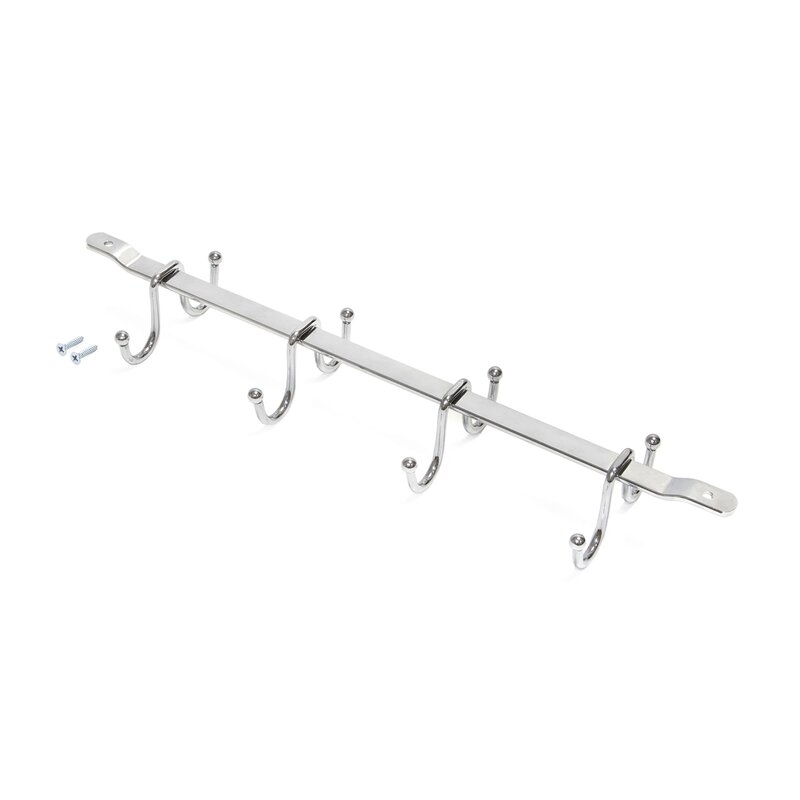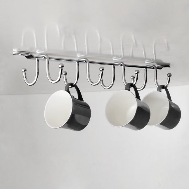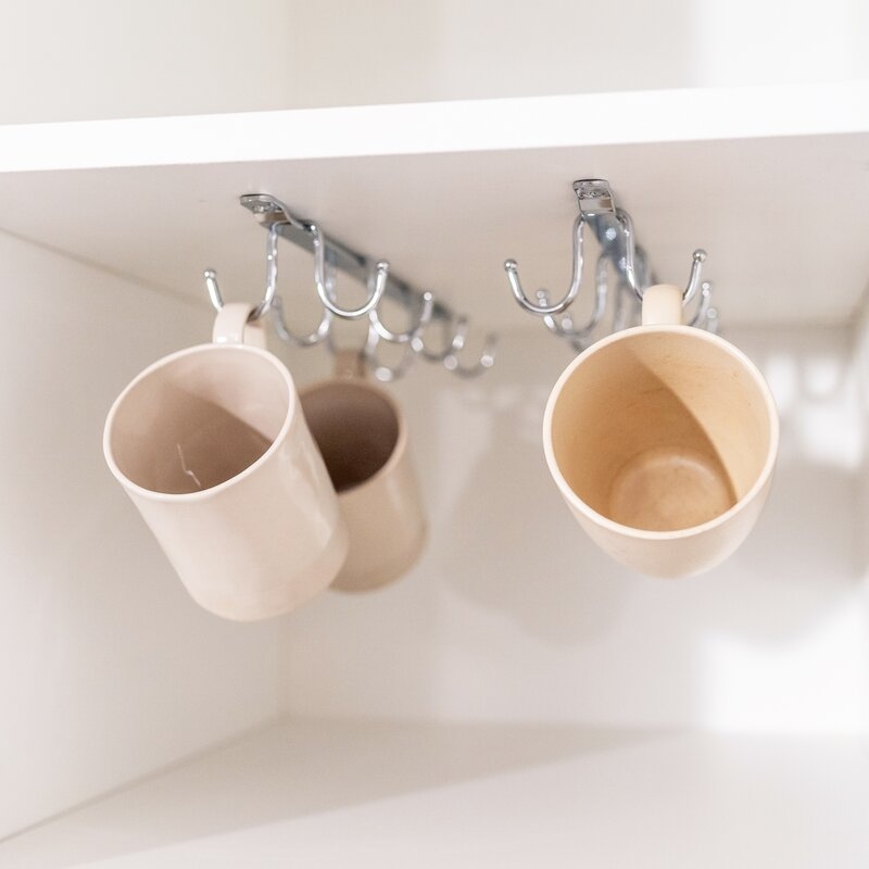 Colgador de tazas con 8 ganchos para muebles de cocina. Se trata de un colgador que te ayudará a organizar el menaje de tu cocina, optimizando el espacio disponible en el interior de muebles, bajo los estantes o mostradores de tu hogar, cocina, bar o restaurante. Gracias a su diseño de alambre en acero cromado se adapta a cualquier estilo de cocina. Se caracteriza por su fácil instalación en el mueble por medio de tornillos que vienen incluidos en el accesorio.
