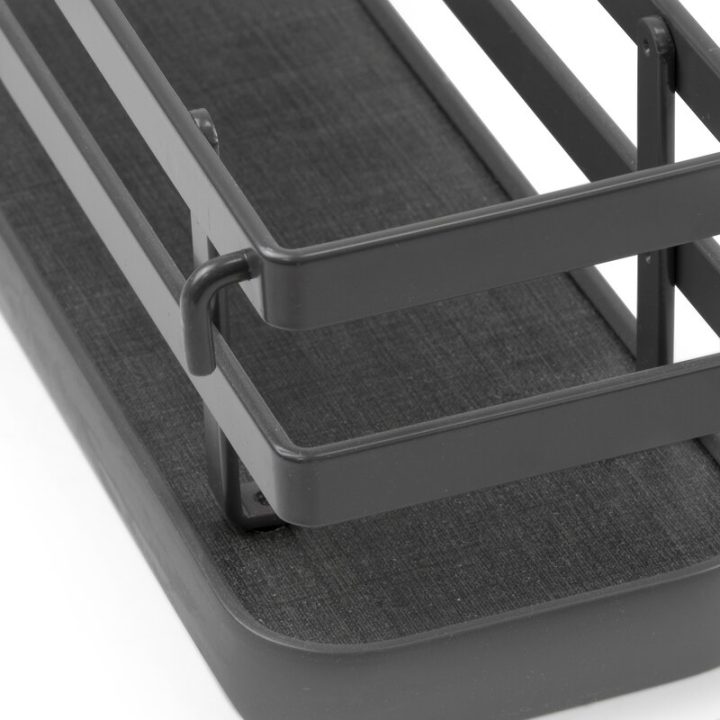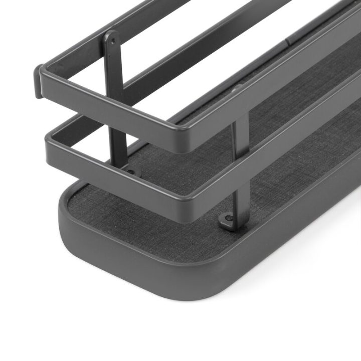 Tanto los perfiles como los estantes tienen un diseño de varilla plana de acero en acabado gris antracita.