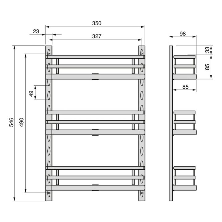 Compuesto de 3 estantes y dos perfiles con múltiples agujeros que permiten variar la posición de los estantes.
