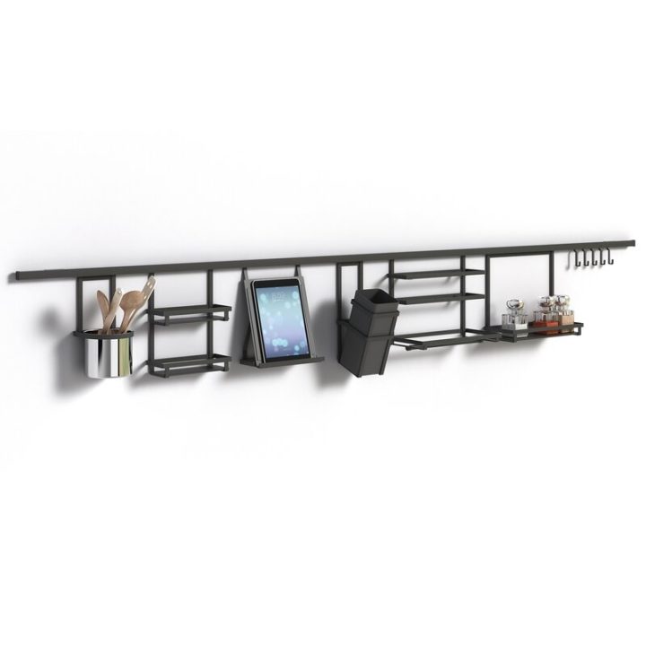 Su elegante diseño en color gris antracita y su estructura de acero plano son la última tendencia en el diseño de cocinas. Se caracterizan por estar suspendidos de un perfil de aluminio fijado a la pared mediante unos soportes, que quedan ocultos dejando libre la cara vista del perfil.