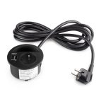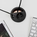 Conector y pasacabales para empotrar en muebles de oficina y hogar, con seguridad infantil integrada.