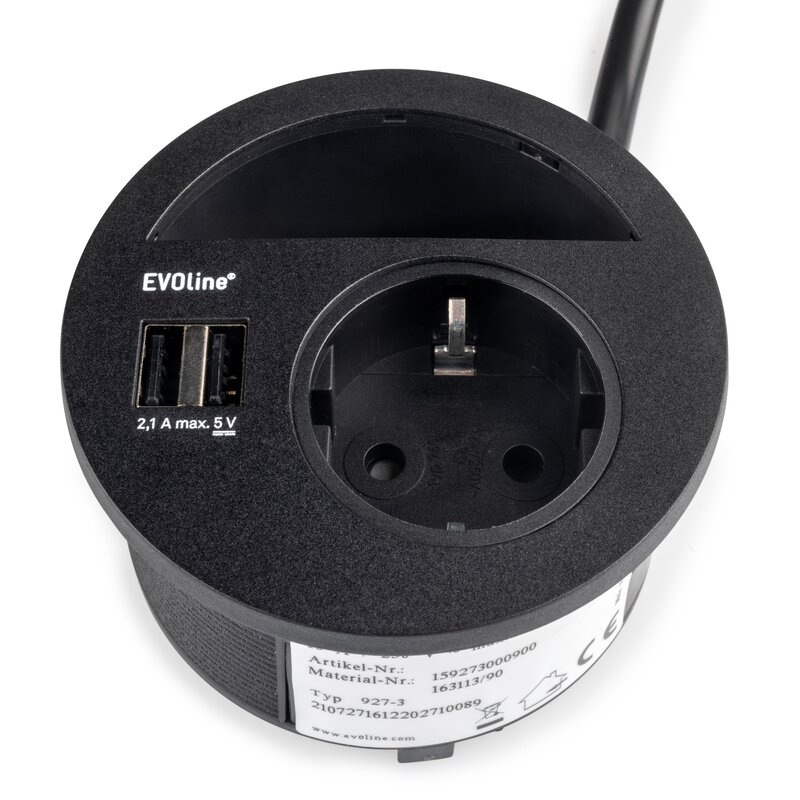 Base multienchufe con pasacables ideal en muebles de oficina y hogar. Está pensada para tener siempre accesible una toma de corriente, dos conectores USB y todos los cables que necesites.