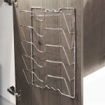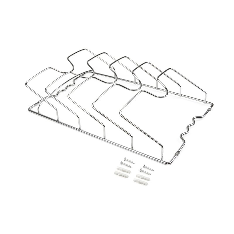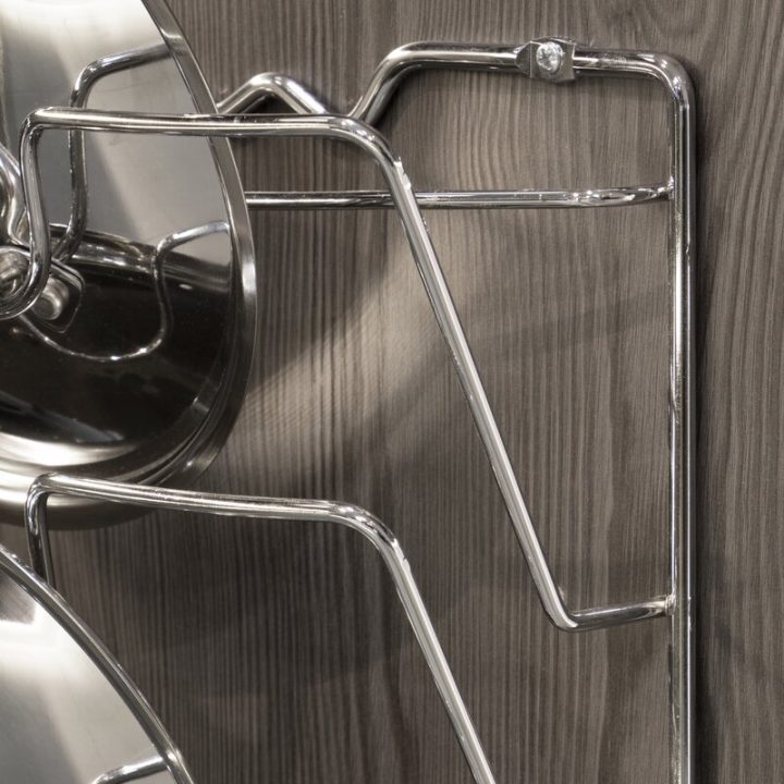 Soporte para almacenar y organizar las tapas de cacerolas y sartenes. Este colgador dispone de 5 huecos que permiten ordenar diferentes tipos de tapas. La instalación del colgador de tapas se puede realizar en la puerta de los muebles de la cocina o en la pared de forma sencilla mediante 4 tornillos que están incluidos. Fabricado en varilla de acero cromado.