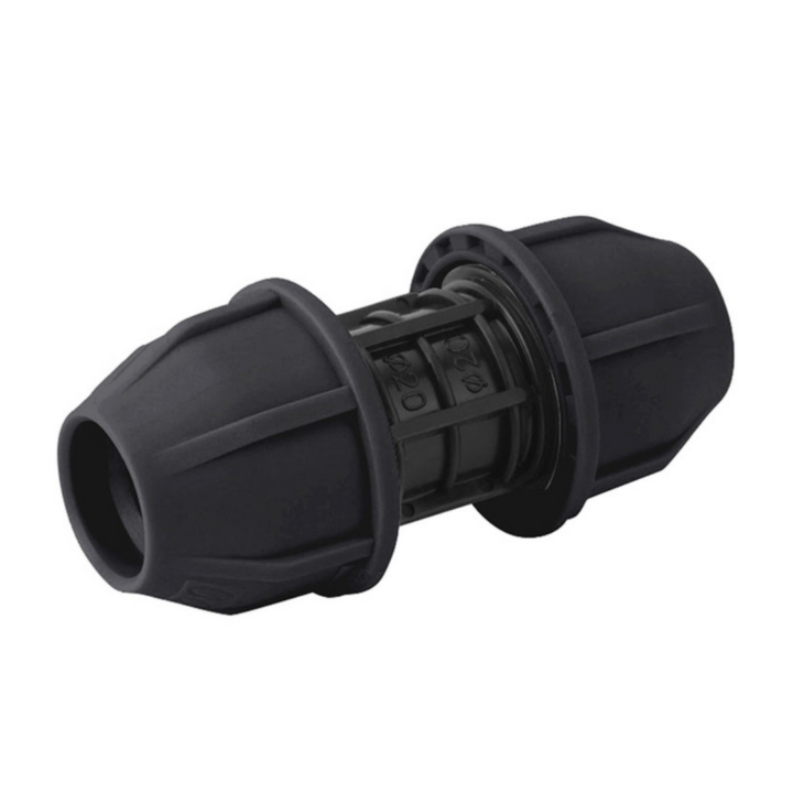 Manguito de presión para tuberías PE, fabricado en polietileno reforzado, conforme a normas UNE-EN 712 y EN 715, disponible en varios diámetros.