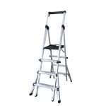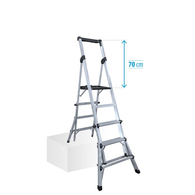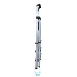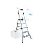 Guardacuerpos, doble cinta de seguridad y ruedas de desplazamiento, opcionales. Plegada ocupa 20 cm de perfil. Con tirantes de seguridad en acero. Se puede utilizar en desniveles.