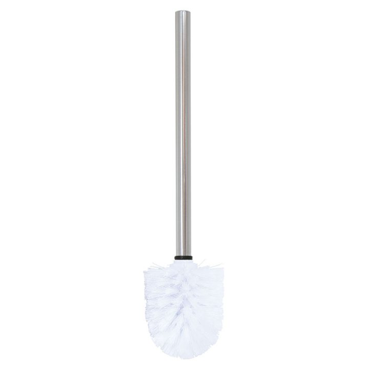 Esta escobilla tiene un cepillo de color blanco y un mango fabricado en acero inoxidable.