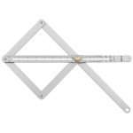 Aluminio anodizado. Rango de medición 20º a 170º. Tornillo de bloqueo de latón. Con colgador. Medición de ángulos interiores y exteriores, trazado, lectura simultánea de bisectrices y ángulos complementarios.