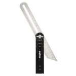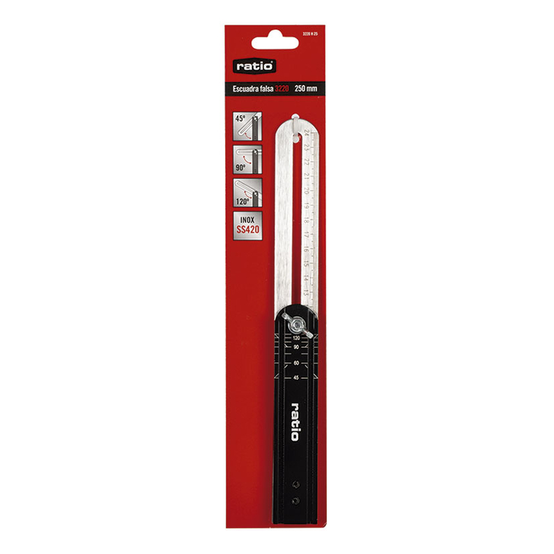Esta escuadra está fabricada en acero inoxidable SS420; dispone de un mango fabricado en aleación de aluminio fundido en color negro anodizado. Es muy funcional y sustituye a reglas sencillas escuadras o dispositivos de marcado. La puedes usar como una escuadra o como instrumento de marcado en ebanistería. Cota de ángulos ajustable de forma variable y fijable mediante tuerca palomilla. Traslación de los ángulos fijados. Se presenta en una placa.