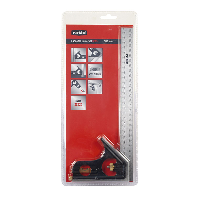 Esta escuadra está fabricada en acero inoxidable SS420; dispone de un mango fabricado en aleación de aluminio fundido en color negro anodizado. Es muy funcional y sustituye a reglas sencillas escuadras o dispositivos de marcado. La puedes usar como una simple escuadra o como instrumento de marcado en ebanistería. Incluye burbuja nivel y transportador; medición de profundidad, trazar una linea en ángulo de 45º, 90º ó 180º. Con escala métrica. Se presenta en doble blíster.