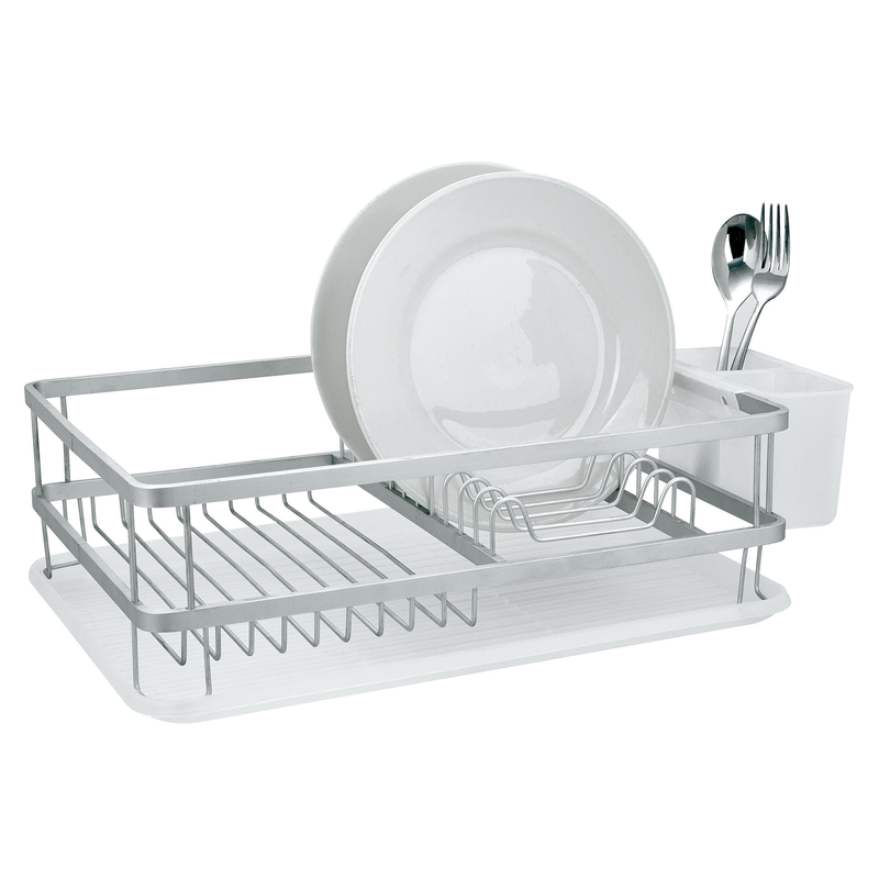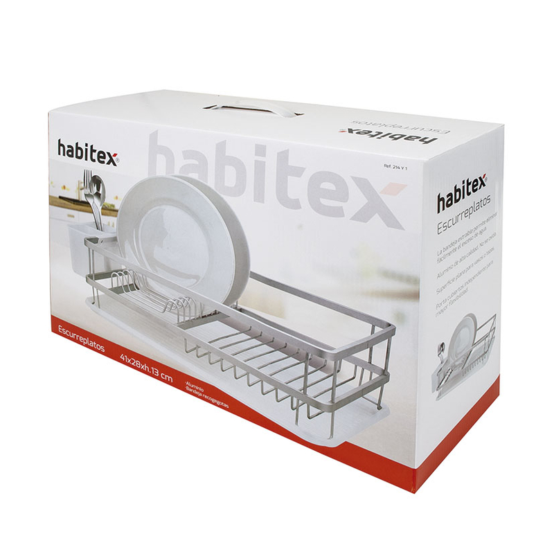 Este escurreplatos HABITEX está fabricado en aluminio con acabado mate. Te permite organizar la vajilla de una forma segura mientras se seca. Dispone de portacubiertos independiente facilitando un espacio extra y una bandeja recogegotas que la puedes extraer cuando haya un exceso de agua. Viene presentado en una caja.