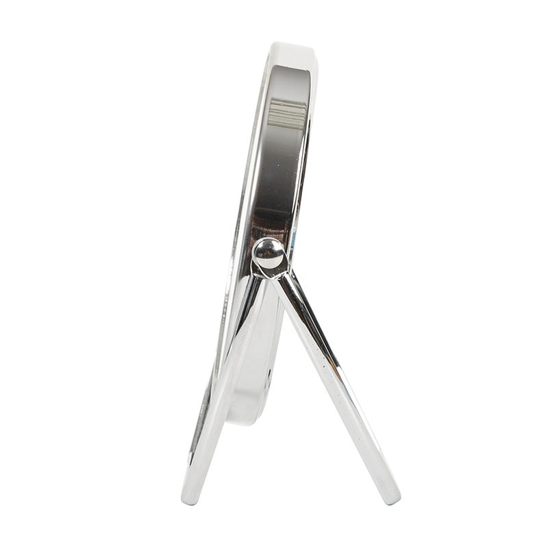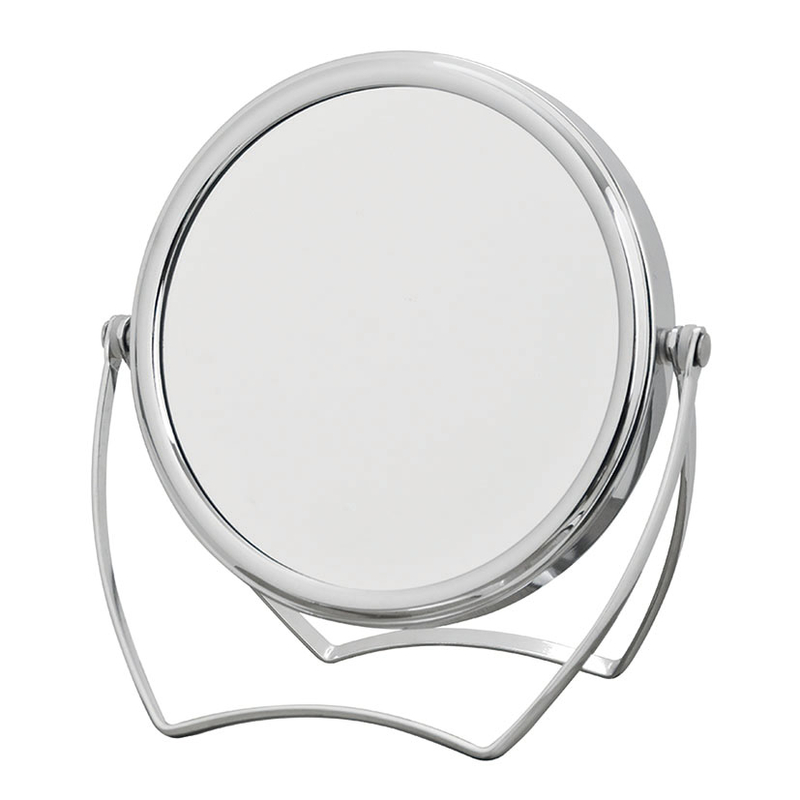 Espejo cosmético con estructura en metal cromado y con doble cara: una cara convencional y otra cara con 3 aumentos. Cuenta con una base soporte abatible con 2 puntos de apoyo. el espejo gira 360º. Viene presentado en una caja.