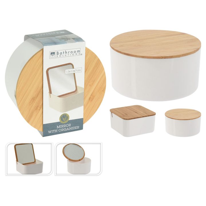 Fabricado en poliestireno con una tapa de bambú. Su diseño multifuncional no solo ofrece un espejo para tus necesidades de maquillaje, sino también un espacio ordenado para guardar tus accesorios esenciales. Disponible en dos modelos surtidos: cuadrado (13 x 13 x h.7 cm) y redondo (ø13 x 6,8 cm), ambos en color blanco.