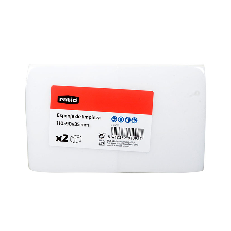 La esponja de limpieza RATIO ProSeries es un borrador elimina manchas compuesto por resina de melamina. Ligeramente abrasiva, elimina manchas sin dañar superficies lisas cuando se humedece ligeramente. Cada paquete contiene 2 unidades de color blanco, con un peso de 2 gramos y una densidad de 9 kg/m³. Ofrece una excelente absorción y alta resistencia a la torsión (>210 kPa). Para su uso, simplemente humedezca con agua limpia; no requiere aditivos.