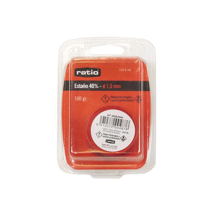 Hilo de estaño de 1,50 mm de diámetro en bobina de 100 g. Se presenta en un doble blíster.