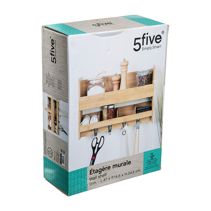 Este estante está fabricado en bambú natural e incluye 4 ganchos para que puedas colgar lo que necesites. Tiene unas dimensiones de 47×14 5xh.34,5 cm y viene presentado en una caja.
