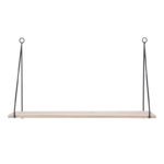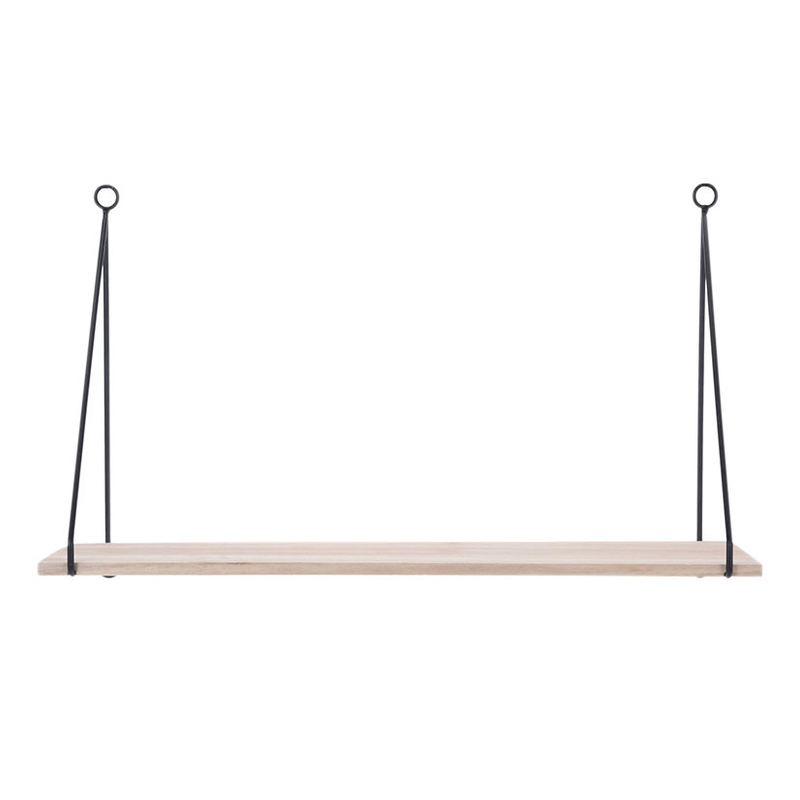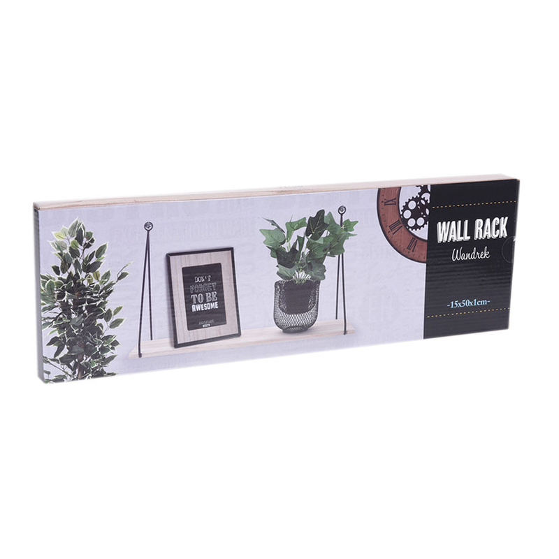 El estante colgante tiene unos soportes metálicos en negro y un tablero en madera. Es ideal para exhibir fotografías recuerdos e incluso flores. Queda bien en cualquier estancia de tu casa. Tiene una fácil instalación, solo requiere introducir dos anclajes de pared y colocar una estantería encima. Tiene unas dimensiones de 50×16 cm.